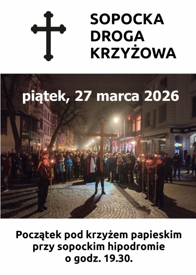 W piątek 27 marca zapraszamy na sopocką drogę krzyżową. Nabożeństwo rozpocznie się pod papieskim krzyżem przy hipodromie o godz. 19.30. Zakończenie w naszym kościele. Wszystkich, którzy nie mogą uczestniczyć w drodze krzyżowej ulicami naszego miasta zapraszamy jak co tydzień na 18.30 do kościoła.